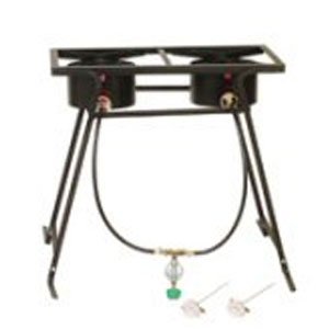 Portable propane double burner outdoor camp stove, 2-54,000 BTU cast burners, 1-Inch angle iron construction, 14-Inch by 28 -Inch cooking surface, listed LP hoses and regulator with type 1 connection and brass needle valves, 26-Inch fold up legs, foot extensions for extra safety and stability, two deep fry thermometers, easy storage and transport, instruction/recipe booklet. CSA design certified.